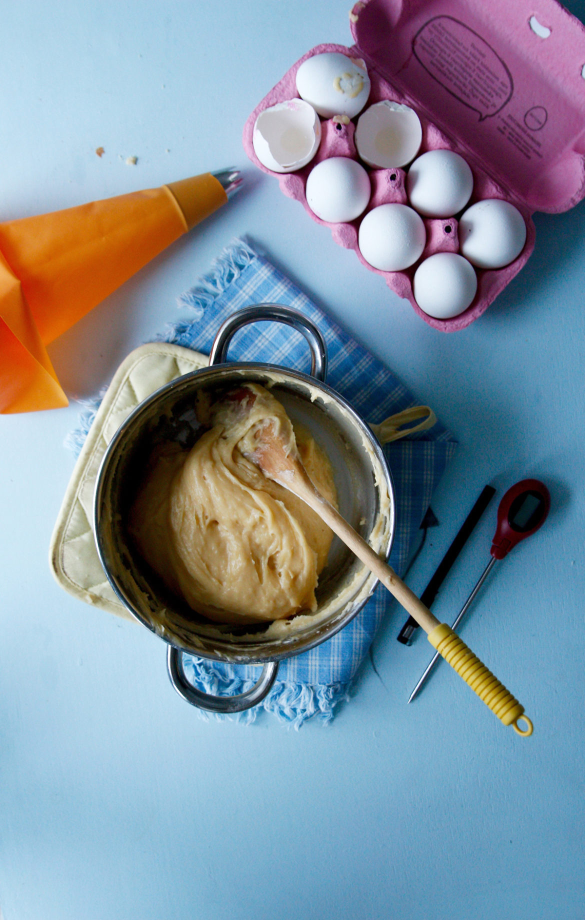 Nüüd lisa jahu ning sool ja sega nii kaua kuni taigen võtab palli kuju. Visplit Sa selleks ei vaja, küll aga head spaatlit ja biitsepsit.  Viimaks lisa kolm muna ja sega seni, kuni taigen on konsistentsilt mõnusalt siidine.