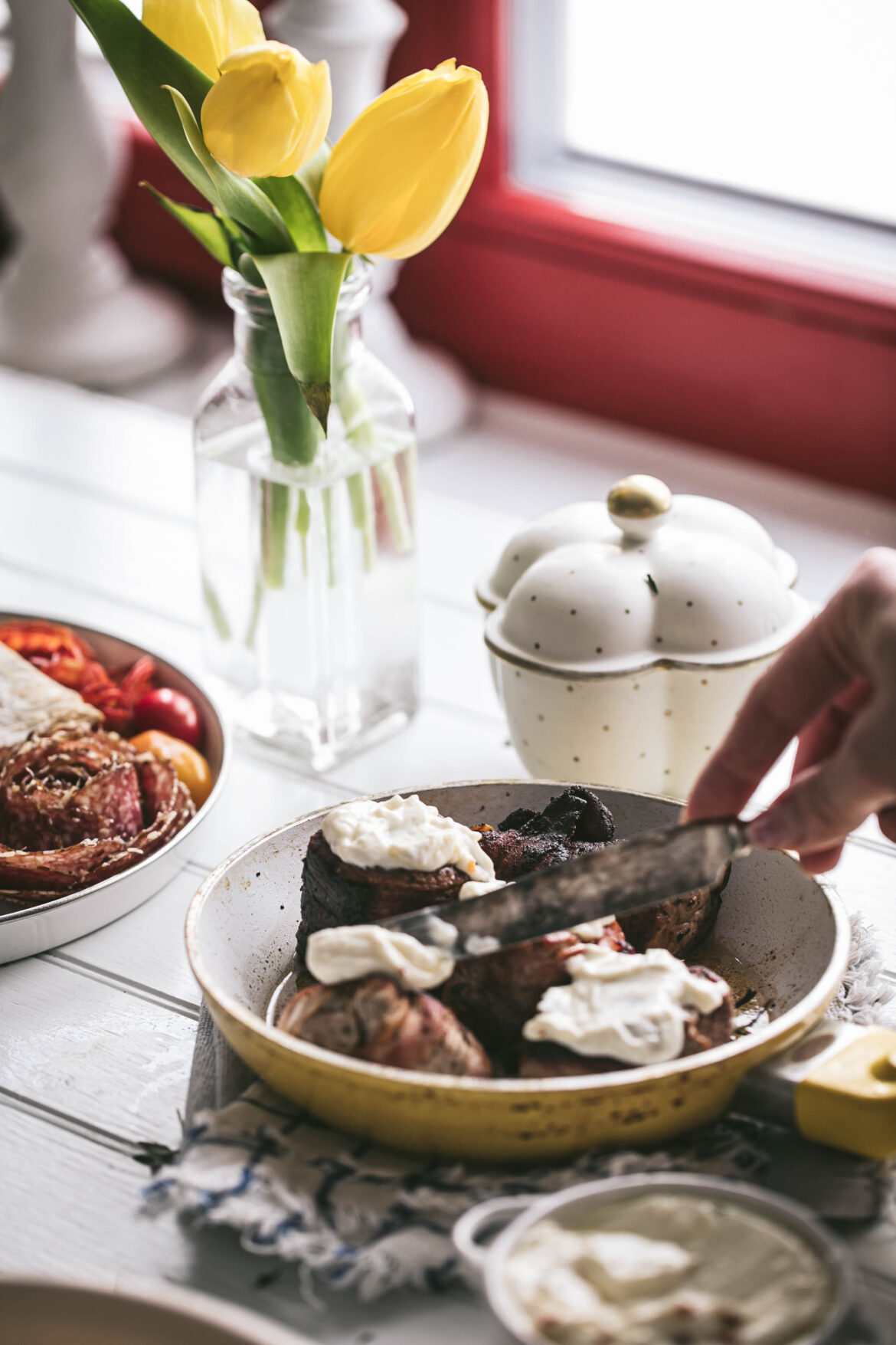 Selle vahustatud fetajuustu retsepti leiad siit - https://www.mustmakroon.ee/vahustatud-fetajuust-ehk-perfektne-dipikaste/ See tegelikult on ülilihtne - 100gr fetajuustu 50ml vahukoort 2-3spl oliivõli 0,5 sidruni mahl ja riivitud koor 1 küüslauguküüs 1spl mett 1spl kuivatatud või värsket tüümiani näpuotsatäis suhkrut Blenderda kõik ühtlaseks vahuks ja serveeri. Sobib imeliselt ka sellele suupistevaagnale Liha jaoks vajad sa 1 pakk Rakvere LK sisefileed 1 pakk Rakvere prociutto peekonit soola, pipart, võid ja õli Aga nüüd selle sisefilee juurde. Minu nipp maksimaalselt head ja mahlast sisefileed teha on - 1. Lasta tal umbes tunnike toatemperatuuril seista. 2. Enne kui ma temaga midagi peale hakkan, kuivatan ta köögipaberi täielikult kuivaks. Töökäik on aga imeliselt lihtne. Kui oled esimesed kaks nippi ära teinud, lõika oma sisefilee medaljonideks. Umbes 6-7cm paksusteks. Viimane osa jäta pikem, kuna see on ka veidi õhem. Maitsesta soola ja pipraga seejärel mässi iga medaljon kindlalt procciuto sisse. Aja pann korralikult kuumaks koos või ja õliga. Ikka nii kuumaks, et see kergelt suitseb. Ja seejärel prae oma medaljonid. Mina praadisin 3 minutit igalt küljelt, ma mõtlen - IGALT küljelt. Ja seejärel tõstsin nad pannilt taldrikule, mässisin kõvasti fooliumi sisse ja jätsin nad sinna rahunema 10-15 minutiks. Liha jäi nii mahlane ja pehme, prociutto lisas vajalikku soolasust ja krõbedust ning see hapuka alatooniga fetajuust andis veel viimase lihvi täiuslikuks roaks.