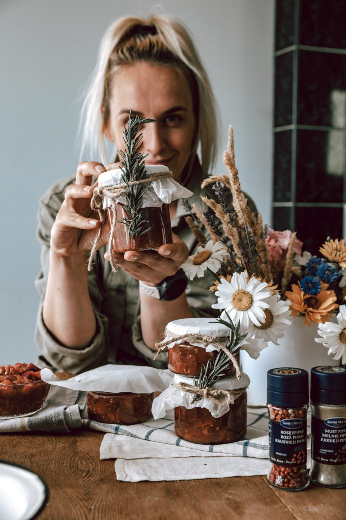 2kg tomateid (ei pea olema kirsstomatid) 1kg punast sibulat 2-3 suuremat rosmariinioksa suurem peotäis basiilikut palsamiäädikat soola-pipart-rosepipart-suhkrut Esmalt steriliseeri nii purgid kui kaaned. Seejärel tükelda ja puhasta tomatid ja punane sibul. Lisa juurde rebitud basiilik ja rosmariini oksad. Lisa suurem supilusika täis soola ja 2 spl suhkrut. Suur peotäis terapipart ja Santa Maria rosepipart. Seejärel u 50-60 ml palsamiäädikat. Alusta kuumutamist keskmisel kuumusel. Sega vahel ja maitse kindlasti. Hoidis on valmis, kui kõik on kergelt läbi kuumutatud, sibul pehme ning maitsetest on tunda nii teravust, soolasust kui ka magusust. Rosmariinioksad võta kindlasti hoidisest välja, kuid basiilik peaks selleks ajaks olema ilusti segunenud ülejäänud maitsete ja tekstuuridega. Pane hoidis purki ja kaaneta koheselt. Antud postitus on tehtud koostöös Santa Maria'ga.