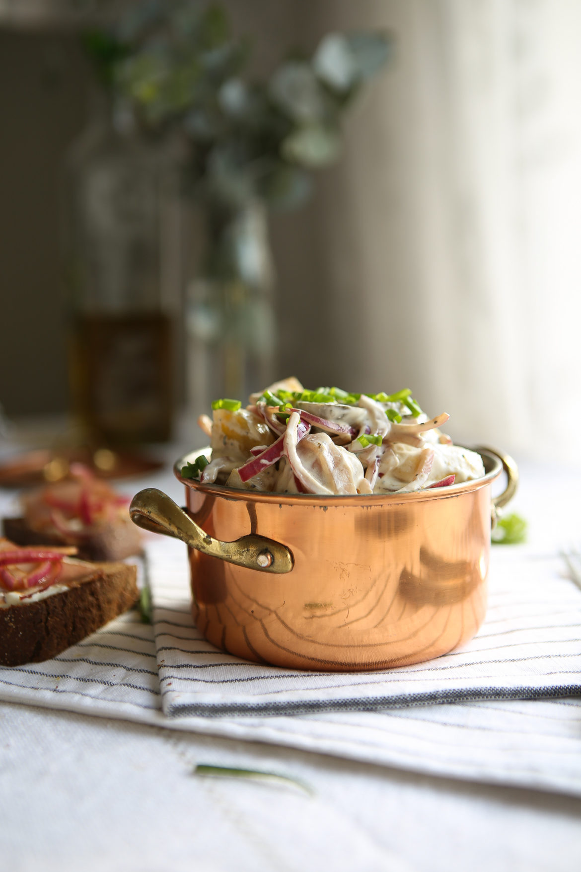 1kg kartul 200gr külmsuitsu välisfileed (võib asendada ka peekoniga, aga sel juhul peaksid selle ahjus ära küpsetama) 300gr maitselt mahe kurk (Salvest) 2 punast sibulat 300gr hapukoor 100gr majonees (Hellmanns) maitseainetest - Santa Maria vahemere ürdisegu (väga tähtis) oliivõli, sidrun, suhkur, sool, pipar, balsamico äädikas Esmalt koori ja tükelda kartul. Maitsesta soola, pipra, oliivõli ja ohtralt Santa Maria vahemere ürdiseguga. Pane esmalt 45 min 180kraadisesse ahju küpsema. Seejärel tükelda punane sibul. Lisa 3-4 spl balsamico äädikat, 1 spl suhkrut, 2-3 spl oliivõli ning paar keeret värskelt jahvatatud pipart. Sule õhukindlalt ja pane külmikusse. Tükelda liha ning hapukurgid lõika ketasteks. Valmista kaste - Selleks sega kokku 300gr hapukoort, 100gr Hellmannsi majoneesi, 1tl sidrunimahla, 1tl suhkrut ja 1spl oliivõli. Mina küpsetan oma kartulied ca 60 min, et nad ikka mõnusalt krõbedaks läheks. Seejärel jahutan ja lõpuks segan kõik komponendid omavahel kokku. See postitus on valminud koostöös Frank Kutter lihameistrite lihaga. Nende uskumatult äge kodulehekülg on www.frankkutter.ee ja sotsiaalmeediast on nad www.facebook.com/Frank-Kutter-340366263016238/.