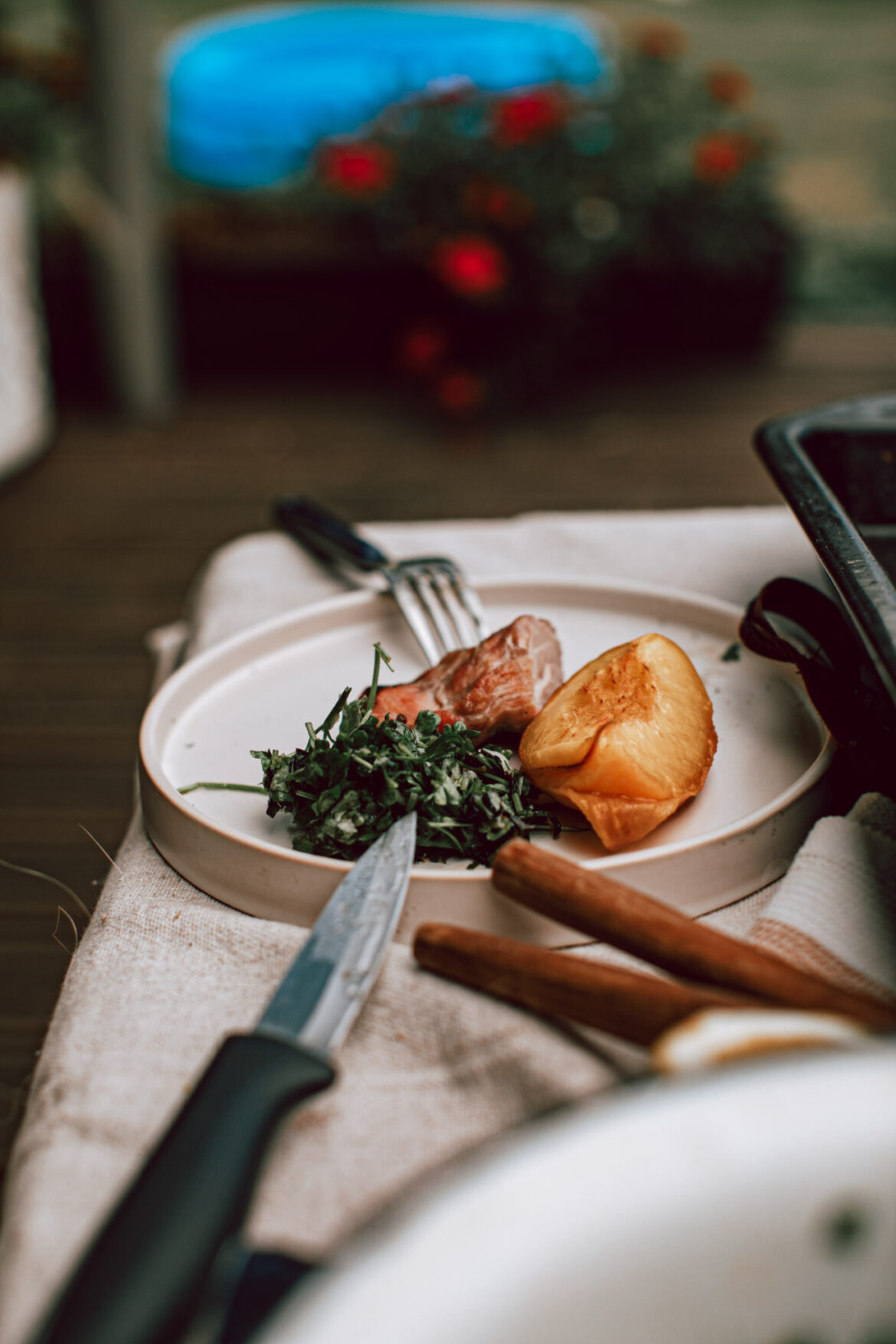 Inspiratsiooni selle retsepti loomiseks sain oma lemmiksarjast Gilmore tüdrukud ja ega seal ülemäära palju retsepti ei paljastatud. Sookie oli teinud oma kuulsat soolvees marineeritud sealiha ja see pidavat suus lihtsalt sulama. Ja nii saingi mina inspiratsiooni oma uueks retseptiks. Meie lisasime sinna siidrit, ohtralt ürte, peotäie pipraid ja kõige lõpuks veel virsikuid. Kõrvale tegime värsket gremolata salatit ja kui on üks õhtu, mis jääb meelde puhtalt vaid toidu pärast, siis on see seesama õhtu. Me lihtsalt sõime kõik ära, veel enne kui olime isegi laua katnud. 1 taldrik, 1 nuga ja 1 kahvel ning meie kolm ja üks paganama maitsev õhtusöök.