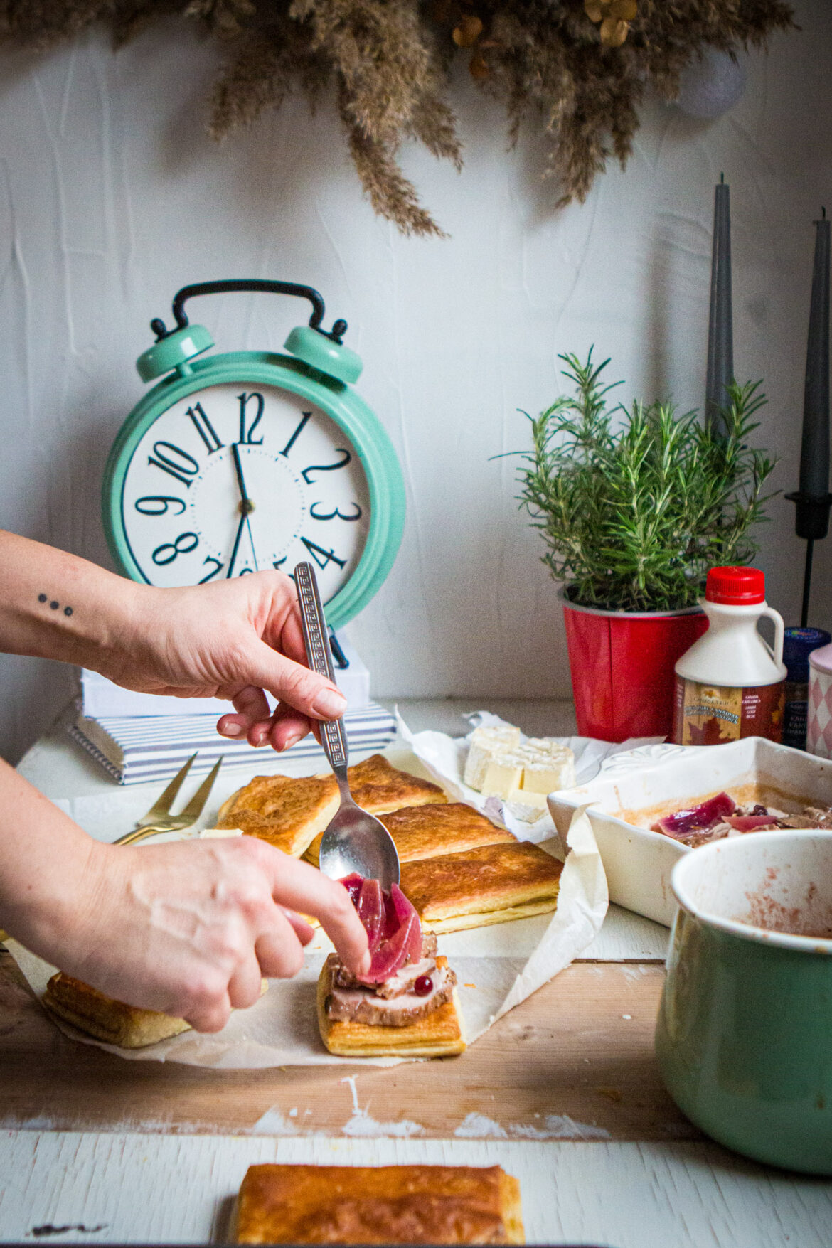1pk pärmi-lehttaigen võiga 1pk brie juustu küpsetatud liha (ideaalselt sobib igasugune liha, mis on jõululaualt üle jäänud) karamelliseeritud pähkleid (Pähklinäpil on sobilikud) Esmalt tõsta mitmeks tunniks pärmi-lehttaignen toatemperatuurile. Seejärel valmista ette oma liha, viiluta see õhukesteks tükkideks ja vaata, et sul oleks piisavalt kastet. Kui kaste liiga vedel, vala see kasrtulisse ja keeda paksemaks. Kui taigen on sulanud, lõika see keskelt pooleks, et jääks kaks ühesuurust ristkülikut. Mina rullisin õrnalt veidi õhemaks ka. Pane kaks ristkülikult üksteisele peale ja lõika 8ks. Ja küpseta 180 kraadi juures ca 8 min. Kui pirukad on eelküpsetatud, pane igale ristkülikule paar viili liha ja kastet. Seejärel paar tükki brie juustu ja küpseta veel u 6-7 min. Kui pirukad on valmis, pane veel kastet ja puista üle uhmerdatud pähklitega. See annab mõnusa krõbeduse ja magusa lõpunoodi. Antud postitus on tehtud koostöös Rakvere LK-ga.